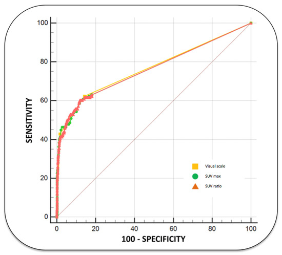 ROC curves demonstrating the global performance of PET for determining neck lymph node metastases using a visual scale, SUV max and SUV ratio. The areas under the ROC curves (AUCs) were similar for each of these parameters (0.762 for SUVmax and SUVR and 0.768 using the visual scale).