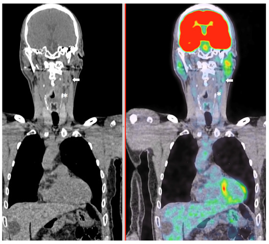 Example of a patient with a left-edge oral cavity cancer and with a [18F]FDG uptake in the ispilateral neck level II (white arrow). Note that the [18F]FDG uptake was grade 1 (SUVmax = 2.6), slightly superior to the jugular internal vein (white asterisk). The histological report confirmed a metastasis in this neck level.