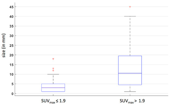 Boxplots evaluating the size of metastases in function of the [18F]FDG uptake using a cutoff SUV max: 1.9. Red crosses corresponded to outliers.