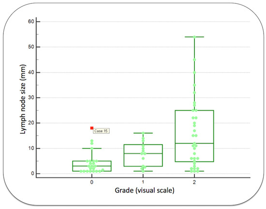 As shown in Figure 5, the median sizes of metastases classified as visual grade 0, 1 or 2 were, respectively, 3.00 mm [1.17 mm; 5.00 mm], 8 mm [5.03 mm; 11.9 mm] and 12.0 mm [11.2 mm; 21.2 mm]. The median size in visual grade 0 was significantly lower compared to visual grades 1 and 2 (p = 0.0298 and, p = 0.0002, respectively). For information, one discordant finding was demonstrated in Figure 5, with a lymph node metastasis of 18 mm with an unusual grade 0 uptake (shown as case 15). For this patient, the PET reader classified a grade 2 uptake in the neck level II and the histological report classified this large metastasis in the level III.