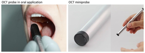 OCT imaging was performed during the clinical consultation directly after anamnesis and visual–tactile examination and diagnosis by an experienced oral and maxillofacial physician. The decision to take a biopsy was made subsequent to the clinical examination without consideration of OCT imaging. Before OCT cross-sectional imaging, the miniprobe was disinfected (Sekusept Aktiv, Ecolab Deutschland GmbH) and covered with a dental disposable plastic sleeve (X-ray Cover, Henry Schein Inc.) (left part in Figure 1). For each patient, OCT imaging of the physician-determined OLP center and surrounding inconspicuous oral mucosa was obtained by having the miniprobe in light contact with the tissue. In addition, oral alterations were documented by clinical photographs.