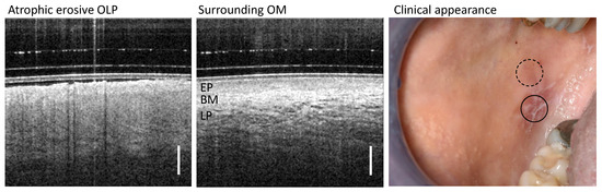 Representative study result of OCT cross-sections of the center of OLP (left) and surrounding oral mucosa (OM) (middle) of patient XII with clinically diagnosed atrophic erosive OLP. Corresponding clinical appearance (right) with marked zones of OCT scanning: OLP center (circle with black solid line) and surrounding OM (circle with black dashed line). Labels: EP: epithelium, BM: basement membrane, LP: lamina propria. Scale bar 500 µm.