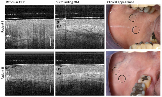 OCT cross-sections of the center of reticular OLP (left column) and surrounding oral mucosa (OM) (middle column) of patient I (upper row) and II (lower row). Corresponding clinical appearance (right column) with marked zones of OCT scanning: OLP center (circle with black solid line) and surrounding OM (circle with black dashed line). Labels: EP: epithelium, BM: basement membrane, LP: lamina propria. Scale bar 500 µm.