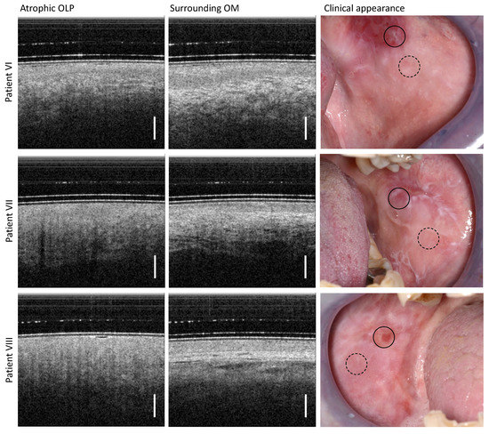 Results of OCT imaging in the center of the atrophic OLP (left column) and the surrounding inconspicuous OM (middle column) of the patients VI (upper row), VII (middle row), and VIII (lower row). The corresponding photographs of the clinical appearance with OCT labeling are shown in the (right column): OLP center (circle with black solid line) and surrounding OM (circle with black dashed line). Scale bar 500 µm.