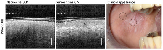 OCT scans of the center of the plaque-like OLP and a measurement site of the surrounding area of patient XIII. Clinical appearance: OLP center (circle with black solid line) and surrounding OM (circle with black dashed line). Scale bar 500 µm.