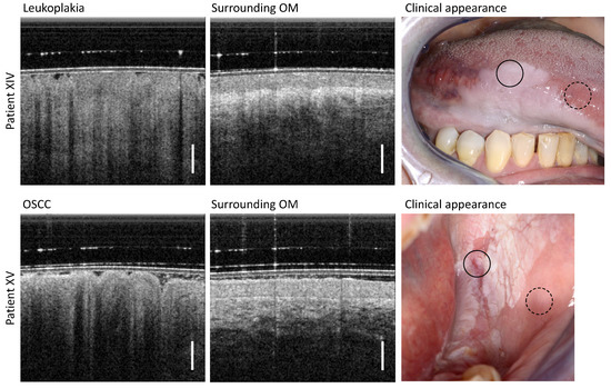 From the clinical perspective, the results of this study, as well as the findings of previous publications, suggest that OCT might complement the visual examination of the oral mucosa at the initial clinical consultation and at the annual follow-up. The example of patient XV, initially clinically diagnosed as inhomogeneous dysplastic leukoplakia but later found to be an OSCC on biopsy, illustrates the possible added value of OCT for valid biopsy sampling. In this context, OCT imaging could potentially serve as an additional decision aid to determine whether a control biopsy should be performed or whether the patient should be readmitted. Concerning, for example, oral leukoplakia, OCT imaging might also support the differentiation of OLP from other oral lesions [17]. Furthermore, according to previous studies [34,35,36], OCT may help in detecting dysplastic epithelial areas within extensive lesions in order to guide more precise biopsies. However, it must be recognized that the identification and assessment of oral dysplasia can, at the moment, only be achieved with a lower sensitivity and especially specificity compared to invasive oral cancer [35,36].