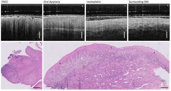 - Jerjes, W.; Hamdoon, Z.; Yousif, A.A.; Al-Rawi, N.H.; Hoppper, C. Epithelial tissue thickness improves optical coherence tomography’s ability in detecting oral cancer. Photodiagnosis Photodyn Ther. 2019, 28, 69–74. [Google Scholar] [CrossRef] [PubMed]