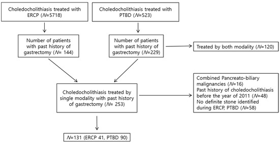 A retrospective analysis was performed on patients who underwent CBD stone removal via ERCP or PTBD between January 2011 and December 2019 for choledocholithiasis following gastrectomy.