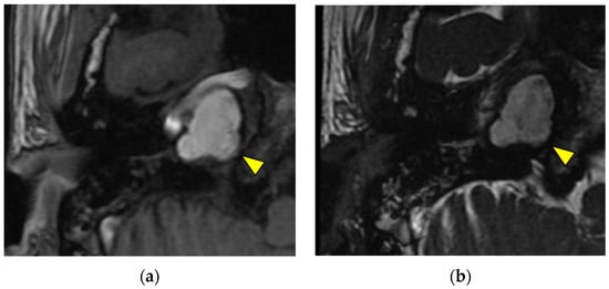 Cholesterol granuloma (yellow triangle) shows hyperintensity in T1-weighted images (a) and heterogeneous hyperintensity in T2-weighted images (b).