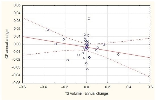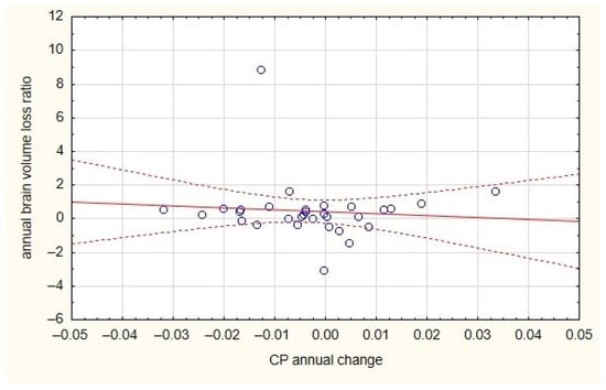 The annual change in the CP/TIV ratio did not correlate with either the change in brain volume or the change in plaques volume in the T2WI MRI (Figure 2 and Figure 3).