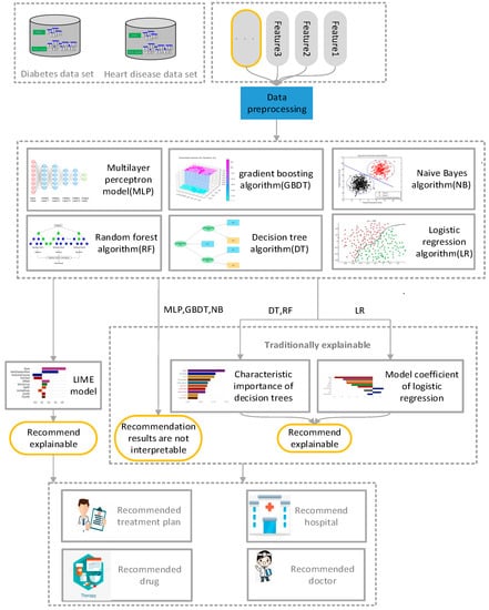 The proposed method realizes the interpretability of the recommendation results of the traditional medical recommendation algorithm, can assist physicians and patients in making corresponding decisions in relation to disease diagnosis, explain the main factors causing the current situation, and remind patients to pay attention to related physical conditions and living habits in daily life. The proposed method is mainly aimed at solving the inexplicable problems of the traditional medical recommendation system. The architecture of the proposed interpretable model is shown in Figure 1. Data preprocessing was applied to the disease data of patients collected from Kaggle, deleting partial data, incomplete, digitized text data. Next, the processed data were respectively trained by naive Bayes algorithm [24], logistic-regression algorithm [25], decision-tree algorithm [26], random-forest algorithm [27], gradient-enhanced-tree algorithm, and multi-layer perceptron [28]. Finally, the results after training were analyzed by LIME algorithm [29,30] to explain the reasons for recommending the results. The details of each method are described in the subsequent sections of this chapter.