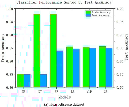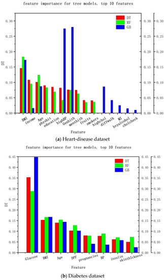 Another way to explain the medical-recommendation system is the feature importance of the decision tree. The explainable range of this method is called the regression model, and its explainable range is relatively wide. Most models that use decision trees are interpretable. The experimental results are shown in Figure 5, where (a) the interpretable results of the heart-disease dataset and (b) the interpretable results of the diabetes dataset are shown. It can be seen that the decision-tree method can analyze the feature importance of the decision tree, random forest, and gradient-enhancement models and provide a feature-importance analysis of the recommendation results in the data set, so as to explain the degree of the contribution of each feature to the recommendation result, which can be used as explanations for recommendation results and provide reasons for patients to accept these results.