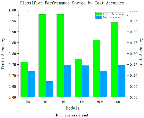 Accuracy is an important performance indicator in recommendation systems, and it is unacceptable to reduce the accuracy in all recommendation systems significantly. Accuracy is an important indicator for the adoption of system recommendations. Relatively complex models can be improved by relatively high accuracy; we conducted accuracy-analysis experiments on six models, including decision tree and linear regression, and the results are shown in Figure 2. It can be seen from the results that the more complex the model, the higher its test accuracy. It can also be seen from the difference between its training accuracy and test accuracy that the relatively complex model is also relatively stable. This was consistent with our speculations.