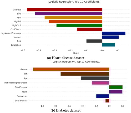 The medical-recommendation system is exceptional, and fundamentally different from the recommendation systems of movies, books, searches, etc. Patients do not use the recommendation system when their attitudes are inappropriate. For patients to fully trust the recommendation system, it must be sufficiently persuasive. The system must give a convincing reason for the recommendation. If this is the case, patients accept the system’s recommendation results, and the medical-recommendation results provide value. Due to the characteristics of the models themselves, some traditional recommendation algorithms can make use of their own characteristic information to make recommendations interpretable; the most common approaches is the model coefficient of the logistic regression model and the linear regression model, whose coefficient itself can explain the degrees of the contributions of different features to the results. The results are shown in Figure 4, where the roles of various characteristics in this patient-recommendation outcome are displayed. (a) The results showed that the current patient did not have heart disease, mainly due to the excellent performance of Genhlth, BMI, age, and HighBP. However, the results should also alert patients to HvyAlcoholConsump. (b) The results showed that the current patient did not have diabetes, mainly because the characteristics of glucose, BMI, age, and diabetes pedigree function were good, but the patient should pay attention to their blood pressure and insulin.