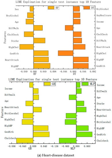 For the heart-disease dataset, both the multilayer perceptron and the gradient-boosting algorithm demonstrated consistent predictions with the local-model recommendations of LIME. This indicates that the local model generated by LIME can serve as an approximate prediction for heart disease. Furthermore, the feature-importance analysis revealed that the features CholCheck, GenHith, and HighBP were identified as the most important factors for heart-disease prediction. These insights provide valuable information to medical practitioners for understanding the key variables contributing to heart disease and making informed treatment decisions.