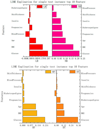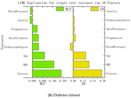 In this study, we implemented interpretability recommendations for a relatively simple classification model (naive Bayes) and interpretability interpretations for a relatively complex multilayer-perceptron model through LIME based on data sets for heart disease and diabetes. The experimental results are shown in Figure 6. We found that regardless of whether it is a simple classification model or a relatively complex model, and of whether it is self-explained or explainable by external models only, the LIME model can offer the interpretation of its recommendation results. Although the essential features of the model that different classification models can explain are varied, from the above, it can be seen that the contribution of these features to the results is positive or negative and is about the same as in the alternatives. This can help us understand which traits are essential and should be retained, and which traits make a low contribution to current disease and can be removed.