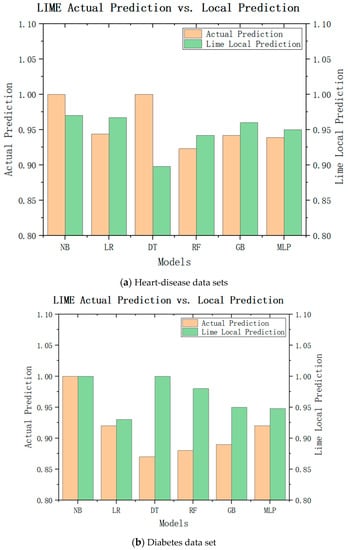While LIME can explain the characteristic importance of these results, we are still unable to draw conclusions. We need to check whether the local model really approximates the original model closely, and to judge whether the LIME local model can replace the model of the recommendation system for recommendation by comparing the difference between the LIME local prediction and the actual prediction. The experimental results are shown in Figure 7a, where green represents the LIME local predictions and brown represents the actual predictions. It can be seen that the actual predicted values of the naive Bayes model, logistic regression, multilayer perceptron, and gradient-enhancement tree were little different with the local prediction effect of LIME, and the trend was consistent with the actual predicted value. Only the LIME prediction for decision tree was significantly different from the actual predicted value. As shown in Figure 7b, the LIME local predicted values of the logistic regression, random forest, gradient enhancement, and multilayer perceptron were little different from the actual predicted values, so they can be used as their approximate models. Therefore, from these experimental results, it can be inferred that the local model can be approximated as an alternative to the original model in LIME interpretation to ensure the interpretability of medical recommendations.