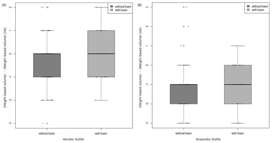 The difference between height-based volume and weight-based volume by foam status (yes/no) in aerobic (A) and anaerobic (B) bottles. Data are medians with interquartile range.