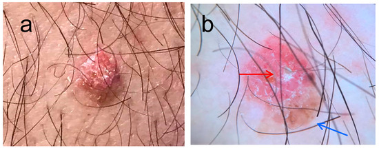 (a) Dome shaped lesion on the left arm of a 67 year old male, present for many years, clinical image, (b) on dermoscopy there is a vascular area (red arrow) with linear vessels and a brownish area resembling a blotch (blue arrow). The differential diagnosis in this case included irritated seborrhoic keratosis, amelanotic melanoma, and BCC.