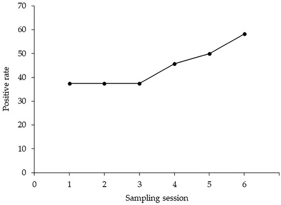 The rate of adequate sample collection was 78.6% (287/365). Table 2 shows the final diagnosis, based on histopathological examination of specimens obtained by surgical resection or EUS-FNA, or clinical follow-up for each cytological diagnosis. Twenty-nine patients (35.4%) had positive PJC, and 28 patients (96.6%) were diagnosed with PDAC. Twenty-three patients (28.0%) had atypical PJC, and 17 patients (73.9%) were diagnosed with PDAC. Thirty patients (36.6%) had negative PJC, and 15 patients (50.0%) were diagnosed with PDAC. The overall sensitivity, specificity, positive predictive value, negative predictive value, and accuracy of the PJC via an ENPD catheter for PDAC were 46.7% (28/60), 95.5% (21/22), 96.6% (28/29), 39.6% (21/53), and 59.8% (49/82), respectively (Table 3). The positivity rates for each session of PJC, from one to six times, were 31.7% (19/60), 25.9% (14/54), 20.0% (10/50), 35.0% (14/40), 37.1% (13/35), and 45.8% (11/24), respectively (Table 4). The cumulative positive rate in the 24 patients with PDAC who underwent six PJC sessions is disclosed in Figure 3. The cumulative positive rate remained flat at 37.5% from the 1st to the 3rd sessions; however, it subsequently increased with the number of sampling sessions, reaching 58.3% at the 6th session.