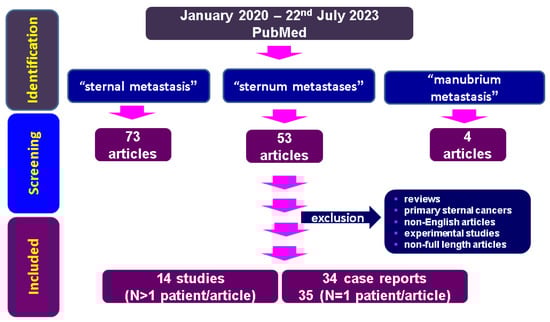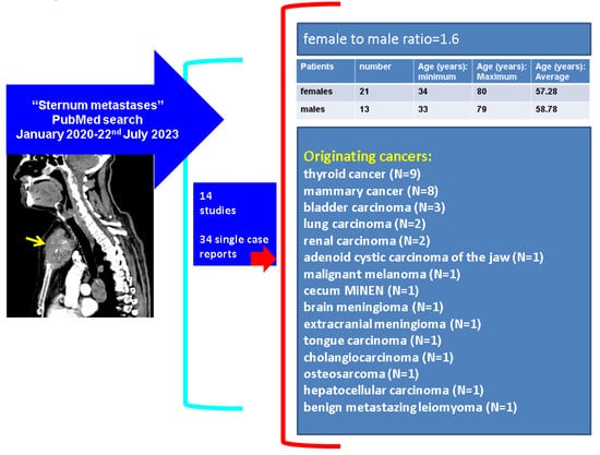 This is a narrative review based on a PubMed search (between January 2020 and 22 July 2023) using the key words “sternal metastasis” (strategy 1), “sternum metastases” (strategy 2), and “manubrium metastasis” (strategy 3) within the title and/or abstract. This 3-year sample-based analysis only included original papers that specifically addressed secondary sternal spreading of cancer in adults (originating from any histological type of malignancy), regardless the level of statistical evidence (original studies, as well as case reports). We excluded papers concerning primary malignant tumours of the sternum, studies addressing chest wall tumours that did not provide specific data on the sternal involvement of a malignancy (metastasis), reviews and editorials, experimental studies, and non-English papers.