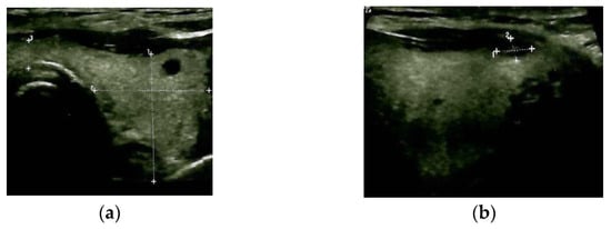 Thyroid ultrasound: multinodular goitre with hypoechoic pattern (a): transverse plane; (b) (right) sagittal plane.