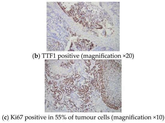 Immunohistochemistry analysis revealed a positive CK7 and TTF1 reaction within the tumour cells and a Ki67 proliferation marker of 55% (Figure 6).