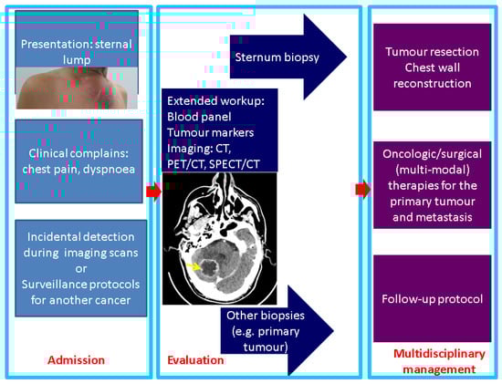 We aim to overview the most recent data on sternal metastases from a multidisciplinary perspective, pinpointing various aspects such as the diagnosis strategies, the outcome with respect to different approaches, and the underlying histological reports.