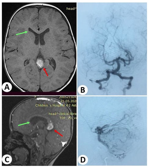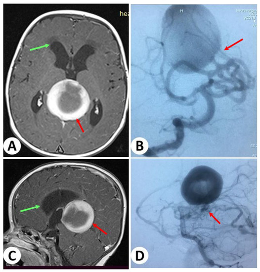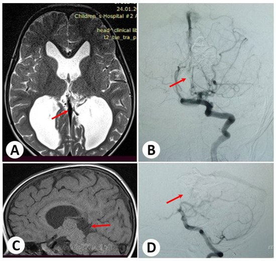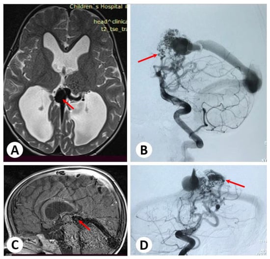 - Lasjaunias, P. Vein of Galen Aneurysmal Malformation. In Vascular Diseases in Neonates, Infants and Children: Interventional Neuroradiology Management; Lasjaunias, P., Ed.; Springer: Berlin/Heidelberg, Germany, 1997; pp. 67–202. ISBN 978-3-662-10740-9. [Google Scholar]