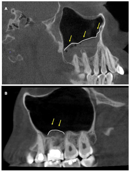 Based on this measurement, the sinus floor was categorized for MT as present (>1 mm) or absent (<1 mm). Furthermore, the presence of MT was classified as localized or generalized as described previously [12] (Figure 1A,B).