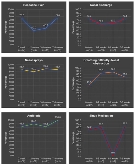 Figure 2 showed the different symptoms patients experienced over the 8 weeks in relation to MT. A significant increase in breathing difficulty/nasal congestion over the time duration was observed in relation to MT (p = 0.018).