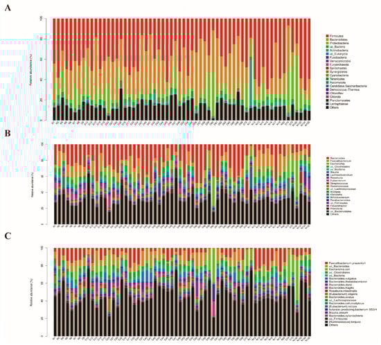 A total of 62 fecal samples from 42 GD patients (16 males/26 females) and 20 healthy individuals (12 males/8 females) were included in our study. The values of serum biochemical markers and parameter distribution of all samples are shown in Table 1. The Scaffolds/Scaftigs of each sample were aligned using BLASTN with the sequences of Bacteria, Archaea, Fungi and Viruses in the NCBI-NT database (Nucleotide collection, ftp://ftp.ncbi.nih.gov/blast/db/) (accessed on 21 February 2023), followed by an analysis of species classification from phylum to species on the MEtaGenome Analyzer platform (http://ab.inf.uni-tuebingen.de/software/megan5) (accessed on 21 February 2023) according to the lowest common ancestor (LCA) algorithm [,].