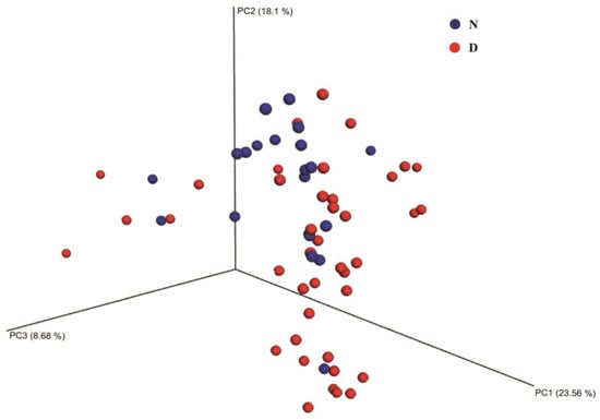 Bray–Curtis-distance-based PCoA of species composition dissimilarity between GD patients and healthy people. The percentages in the axes represent the proportion of differences in the original data, which the corresponding principal coordinates can explain. Each point represents a sample and points of different colors belong to different groups. Note: N: healthy individuals, D: GD patients.