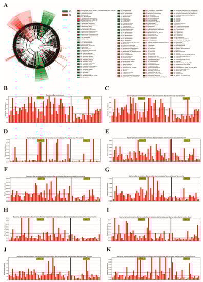 Analysis of the specific intestinal microbes in GD patients compared with those in healthy individuals with the LEfSe method. (A) The taxonomic rank shows the subordination of the species in turn from the inner circle to the outer circle. The node size corresponds to the average relative abundances of species. The node color indicates the species with significant dissimilarities between groups. The names of different species are identified using letters. (B–K) Intestinal microbes with the most significant difference in the patient group compared to those in healthy people. Note: N: healthy individuals, D: GD patients.