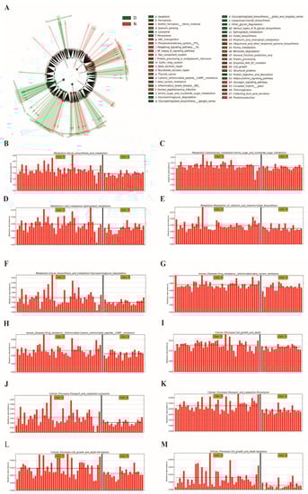 The LEfSe method was used to further explore the functions of differential gut microbes in GD patients according to the abundance spectra of basic functional groups of all samples annotated in the KEGG database []. The results revealed that the gut microbial function could be divided into several sections, including metabolism, human diseases, cellular processes and organismal systems.