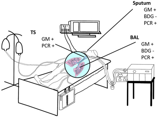Schematic illustration of specimen used for diagnosis of IPA. BAL-bronchoalveolar lavage; BDG—(1→3)-β-d-glucan 1,3; GM-galactomannan; TS-Tracheal secretion; +—recommended; −—not recommended.