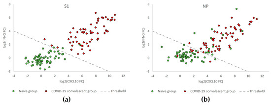 IFNG and CXCL10 mRNA expression levels in samples from donors of the naïve versus the COVID-19 convalescent groups (n = 68 vs. n = 62) obtained with T-Track® SARS-CoV-2 reactive for S1 (a) and for NP (b) antigens. Scatter plot showing log2-transformed fold change (FC) values of IFNG and CXCL10 mRNA levels in samples from COVID-19 convalescent (red diamonds) and naïve participants (green circles). The dashed line (classification threshold) classifies the samples into “positive” (upper right) and “negative” (lower left).