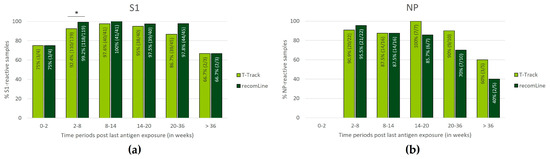 Distribution of samples reactive to S1 (a) or NP (b) antigen using T-Track® SARS-CoV-2 and recomLine SARS-CoV-2 IgG assays according to the time from the last antigen exposure (defined time periods of 0–2, 2–8, 8–14, 14–20, 20–36, and >36 weeks post last antigen exposure). In (a), the analysis included donors immunised with spike mRNA-based vaccines (1×-, 2×-, 3×-vaccinated) or by SARS-CoV-2 infection (COVID-19 convalescent donors), thus exposed to S1 antigen. In (b), the analysis included COVID-19 convalescent donors only (exposed to NP antigen). Only samples with valid results for both T-Track® SARS-CoV-2 and recomLine SARS-CoV-2 were included in the analysis. In (a,b), the proportions and percentages of reactive samples are indicated within the diagram bars. * p < 0.05.
