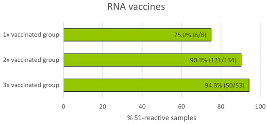 Next, T-cell-mediated immune responses measured by T-Track® SARS-CoV-2 were compared in donors who had received one, two, or three doses of mRNA vaccine. Of the 205 samples from vaccinated donors (Figure 2 and Table 1), 9 with invalid and 1 with inconclusive T-Track® SARS-CoV-2 results were excluded. Therefore, a total of 195 samples were included in this analysis, of which 8 donors were vaccinated once, 134 were vaccinated twice, and 53 were vaccinated three times (Figure 6). As expected, the proportion of S1-reactive donors increased with the number of vaccinations (from 75.0% to 94.3%).