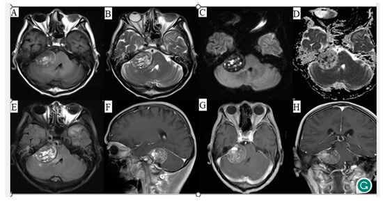 Magnetic resonance imaging (MRI) of the patient’s head with corresponding image sequences. (A) T1-weighted imaging, (B) T2-weighted imaging, (C) Diffusion-weighted imaging, (D) Apparent diffusion coefficient, (E) Fluid attenuated inversion recovery, (F) Sagittal contrast-enhanced scan, (G) Axial contrast-enhanced scan, (H) Coronal contrast-enhanced scan.