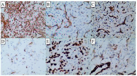 Immunohistochemical staining of the lesion demonstrated positive reactivity for vimentin (A) throughout and revealed scattered weak positivity for SMA (B) in the vascular regions. Additionally, the vascular regions exhibited positive staining for CD31 (C), ERG (D), Ki-67 (E), and CD34 (F). The original magnification is 20X.