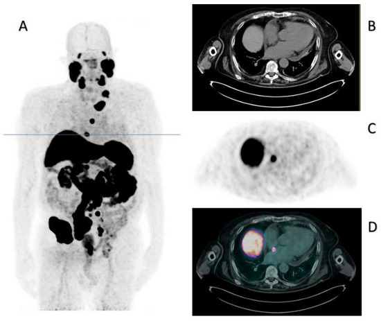PSMA PET/CT of October 2022. Panel (A) displays the maximum intensity projection (MIP), where the blue line indicates the slice corresponding to the cardiac metastasis. Panels (B–D) indicate the CT, PET, and fused PET/CT corresponding axial images.