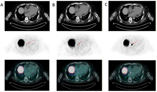 Evolution of the interatrial septum lesion. PSMA PET/CTs from January 2022 (A), June 2022 (B), and October 2022 (C) are displayed. All panels from the upper to the lower images represent axial CT, PET, and hybrid PET/CT obtained at the same slice displayed in Figure 1. The red arrows indicate the location of the interatrial metastasis, which was absent in January 2022 (A), was displayed as a site of minimum (though not significant) tracer uptake in June 2022 (B), and was clearly evident in October 2022, with a maximum SUV equal to 20 (C).