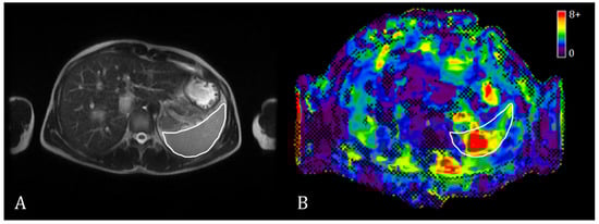 Exemplary T2w MR image (A) and a stiffness map with a confidence mask (B) in spleen MRE. The spleen is outlined with a white contour.