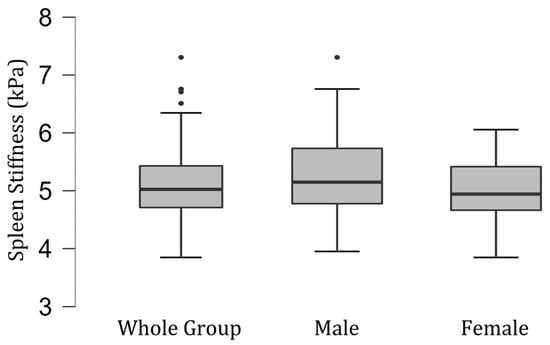 The difference in splenic stiffness between female (mean [SD], 4.98 [0.51] kPa; range 3.89–6.03 kPa) and male volunteers (mean [SD], 5.28 [0.78] kPa; range 3.99–7.24 kPa) was not significant statistically (p = 0.12) (Figure 2).
