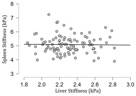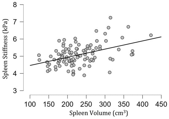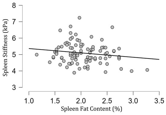 The estimated fat content in the spleen and spleen R2* also did not impact its stiffness in healthy volunteers. On the other hand, we observed a statistically significant correlation between spleen stiffness and spleen volume in healthy volunteers.