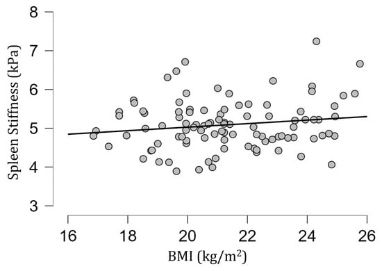 The mean [SD] spleen fat content value was 2.04 [0.39]%, ranging from 1.15% to 3.27%, and no correlation with spleen stiffness was found (rho= −0.13; p = 0.20) (Figure 3). Spleen stiffness did not correlate with spleen R2* (rho = 0.03, p = 0.74), BMI (rho = 0.09; p = 0.36) (Figure 4), and liver stiffness (rho = 0.01; p = 0.95) (Figure 5). However, spleen stiffness was found to be positively correlated with spleen volume, and this relationship was statistically significant (rho = 0.40, p < 0.001) (Figure 6). The results are summarized in the Table 1.