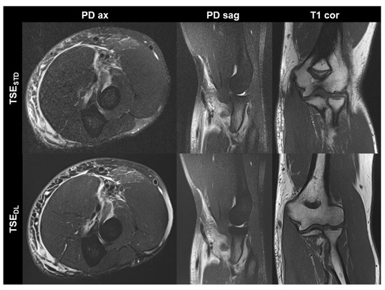 Non-contrast elbow MRI acquired at 3 T in a 70-year-old male patient with the institution’s standard turbo spin echo (TSE) sequences (TSESTD, upper row) and deep learning-reconstructed TSE sequences (TSEDL, lower row). In this example the standard and DL-reconstructed images show very similar image quality. In the TSEDL images, all anatomic details are well depicted, showing that the reduced acquisition time did not lead to a loss in detail. Additionally, edge sharpness in the coronal T1-weighted images (T1 cor) is slightly increased in the TSEDL image.