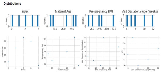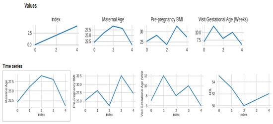 The data collected included maternal age, pre-pregnancy BMI, gestational age at the first prenatal visit, maternal weight gain during pregnancy, blood pressure measurements, fasting glucose levels, maternal history of gestational diabetes or diabetes, and family history of diabetes. We included data from women with high-risk pregnancies, which were defined as those with a history of gestational diabetes, pre-existing diabetes, or a BMI over 30. We preprocessed the collected data to remove missing or invalid data, normalize numerical data, and one-hot encode categorical data. We performed quality control checks to ensure the data was accurate and complete. We used feature selection techniques, such as correlation analysis and recursive feature elimination, to identify the most relevant features for macrosomia prediction. This Figure 3 presents a visual representation of the dataset’s distribution along with 2-D distributions, illustrating the data’s characteristics and relationships. The figure enhances the understanding of the dataset’s structure and serves as a valuable exploratory tool for further analysis. Figure 4 showcases a visual representation of the dataset’s values and time-series data. The figure offers insights into the temporal trends and patterns present within the dataset, facilitating a deeper understanding of the underlying dynamics and contributing to the comprehensive analysis presented in this study. We aimed to select the minimum set of features that could achieve high prediction accuracy. We selected three algorithms, including logistic regression, support vector machine, and random forest, for developing the machine learning-based model. We chose these algorithms based on their performance in previous studies and their ability to handle linear and non-linear relationships between features.