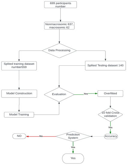 In our research paper, we implemented a specific data collection process to gather the necessary data for developing an early prediction model for macrosomia. We obtained the data from a publicly available dataset on Kaggle and our dataset consists of 699 patients’ data, which provided information on gestational ages ranging from 7 to 10 weeks. This time frame was chosen because it allows for early prediction, enabling healthcare providers to intervene and make informed decisions in a timely manner. To ensure the relevance of the collected data, we focused on a defined set of features that were crucial for our study. These features were originally prepared for a dataset related to Gestational Diabetes Mellitus, which provided valuable information related to maternal characteristics, clinical history, and other factors that could potentially influence the development of macrosomia. Upon obtaining the dataset, we performed a manual examination to remove incomplete instances. This step was important to ensure the quality and reliability of the data used in our study. By removing incomplete instances, we aimed to enhance the accuracy and validity of our analysis, as we focused on developing a clinical decision-making support system. By following this data collection process, we were able to gather a relevant and reliable dataset that encompassed the necessary information for predicting macrosomia in the early stages of pregnancy. This dataset formed the foundation for the development of our machine-learning model and subsequent analysis in our research paper. The architecture of our approach is shown in Figure 2. Next, used the processed data to build a machine learning model based on logistic regression. This model was trained on a subset of the data and validated on a separate holdout set to assess its performance. Using this model, we then made predictions of macrosomia risk for each patient in the dataset. For patients who were identified as high-risk, we recommended an intervention process to reduce the risk of complications associated with macrosomia. This intervention process involved a personalized plan of care, including dietary changes, exercise recommendations, and monitoring of maternal and fetal health. We collected data from the electronic medical records of pregnant women who received prenatal care at a hospital or clinic.